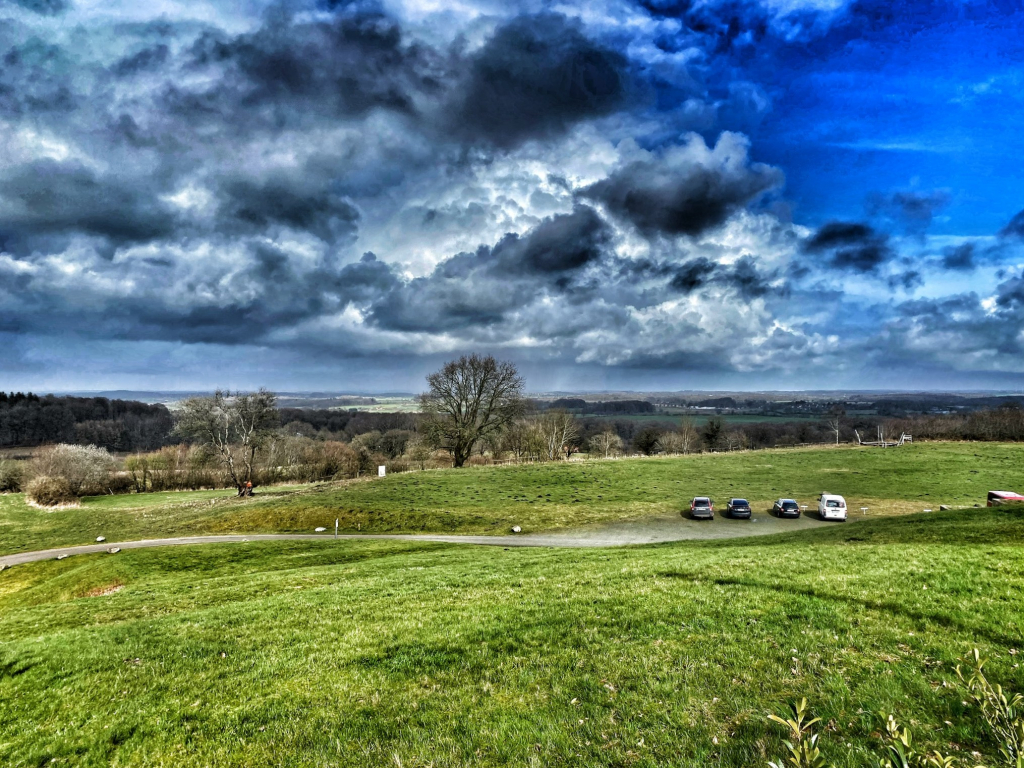 In Schleswig machte sich ein wenig Erleichterung in der Gruppe breit. Den schlimmsten Gegenwind hatten wir geschafft und ab jetzt ging es wieder Richtung Heimat. Vorher aber erst einmal bei einem heißen Kaffee in der Tankstelle durchwärmen. Wieder auf den Rädern sahen wir sogar so etwas wie Sonne am Himmel. Tatsächlich konnten wir die Strecke durch die Hüttener Berge ohne Regen genießen und hatten auf dem Aschberg einen Hauch schöne Aussicht.