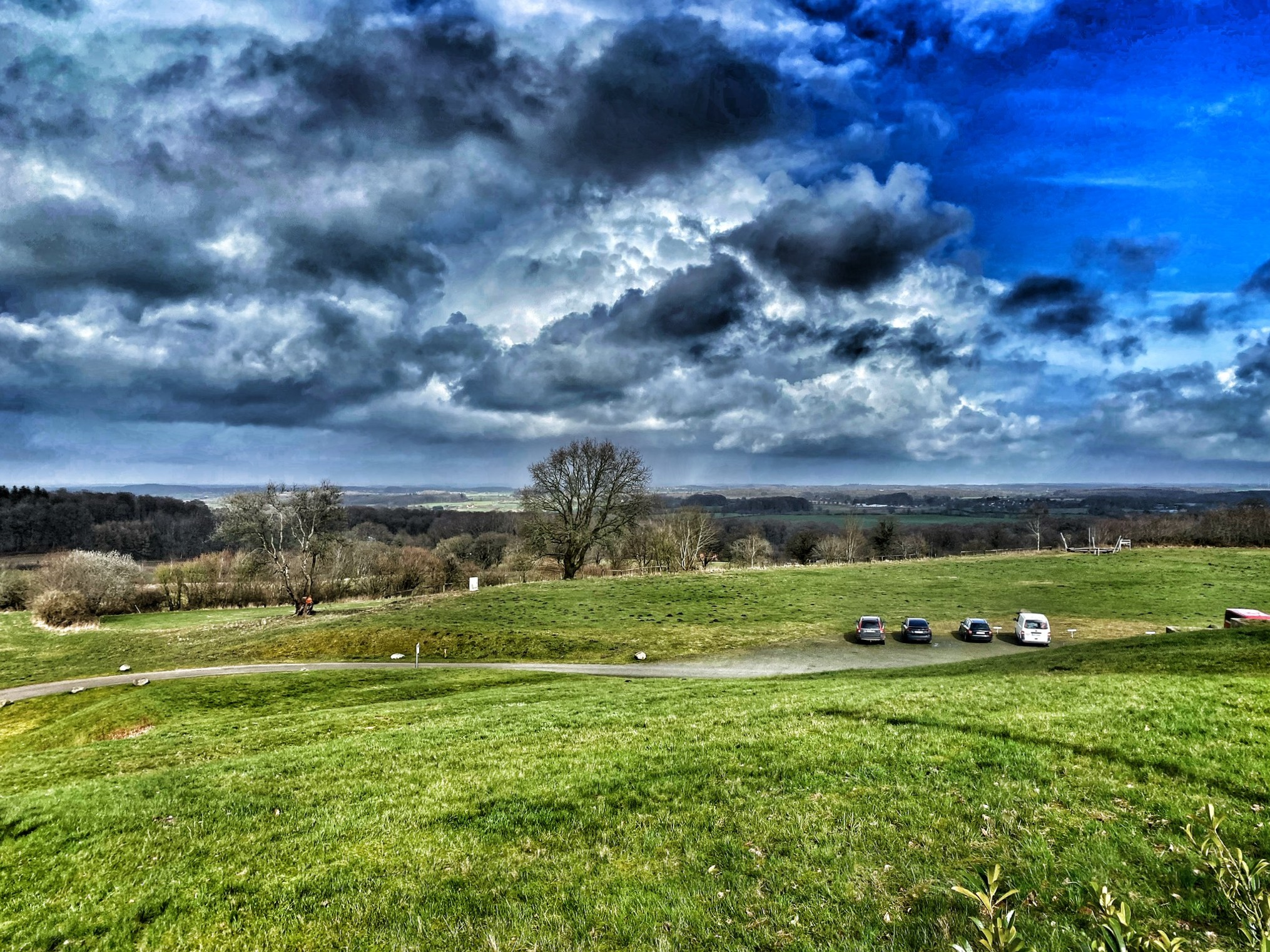 In Schleswig machte sich ein wenig Erleichterung in der Gruppe breit. Den schlimmsten Gegenwind hatten wir geschafft und ab jetzt ging es wieder Richtung Heimat. Vorher aber erst einmal bei einem heißen Kaffee in der Tankstelle durchwärmen. Wieder auf den Rädern sahen wir sogar so etwas wie Sonne am Himmel. Tatsächlich konnten wir die Strecke durch die Hüttener Berge ohne Regen genießen und hatten auf dem Aschberg einen Hauch schöne Aussicht.
