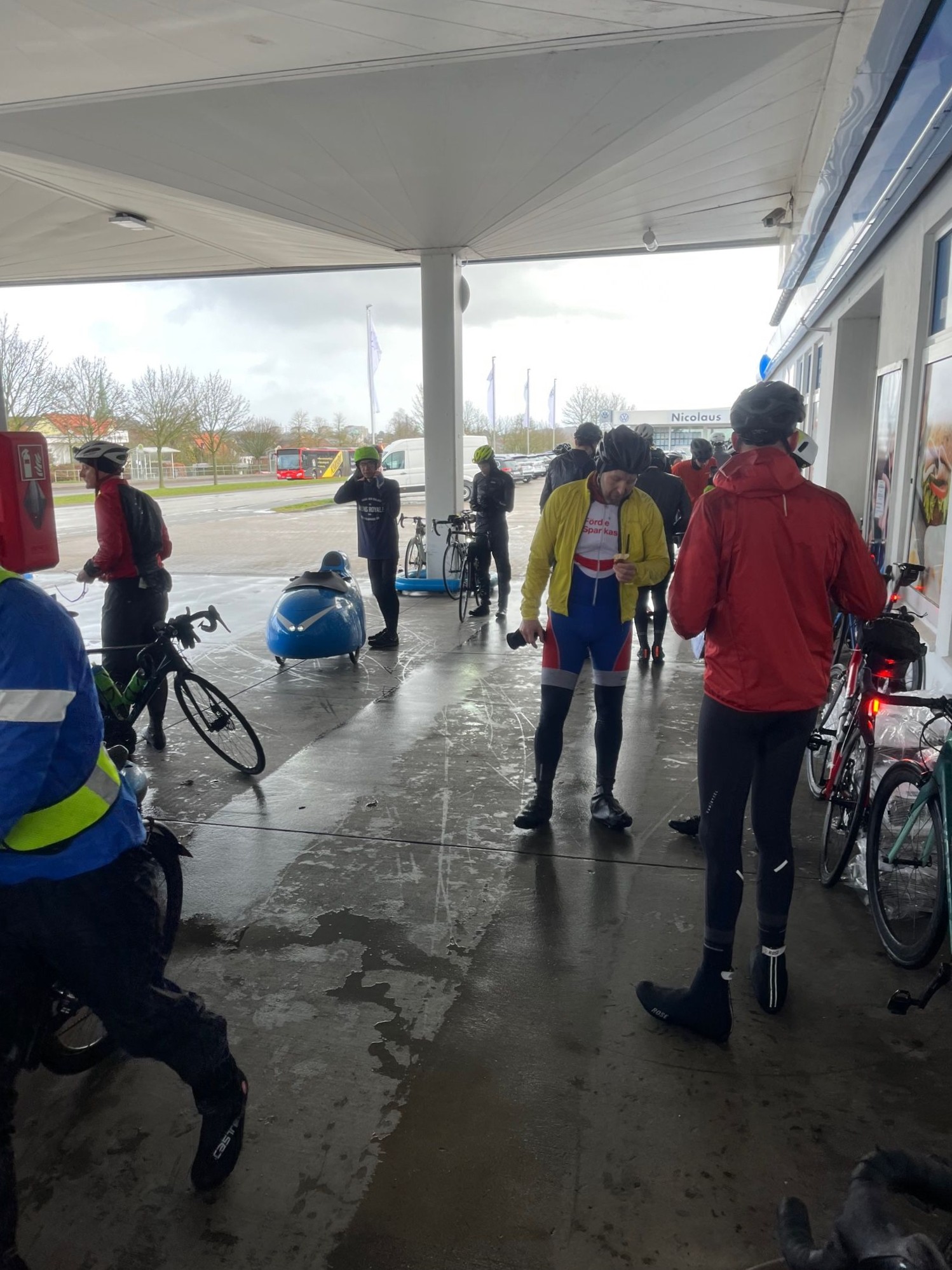 Als wir am Nord-Ostsee-Kanal auf die Fähre warteten, holte uns der Regen wieder ein und begleitete uns den Rest der Tour. Am Westensee vorbei, fuhren wir zur letzten Kontrolle in Rotenhahn. Ein letzter Stempel, ein letzter Riegel und jetzt nur noch 23 km mit Rückenwind nach Hause rollen…